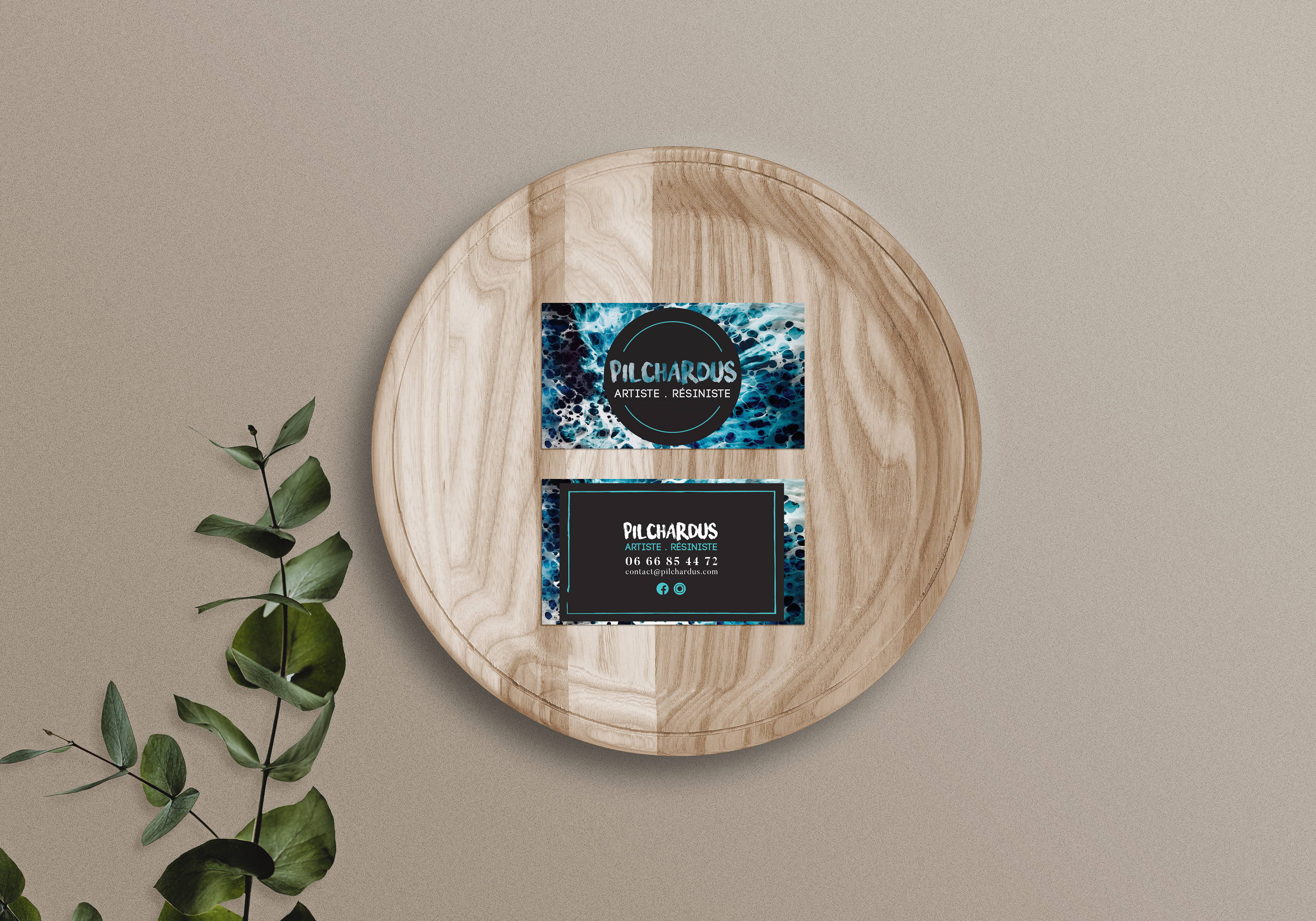Carte de visite Pilchardus. Recto/Verso pelliculage mat Soft Touch & vernis sélectif 3D.