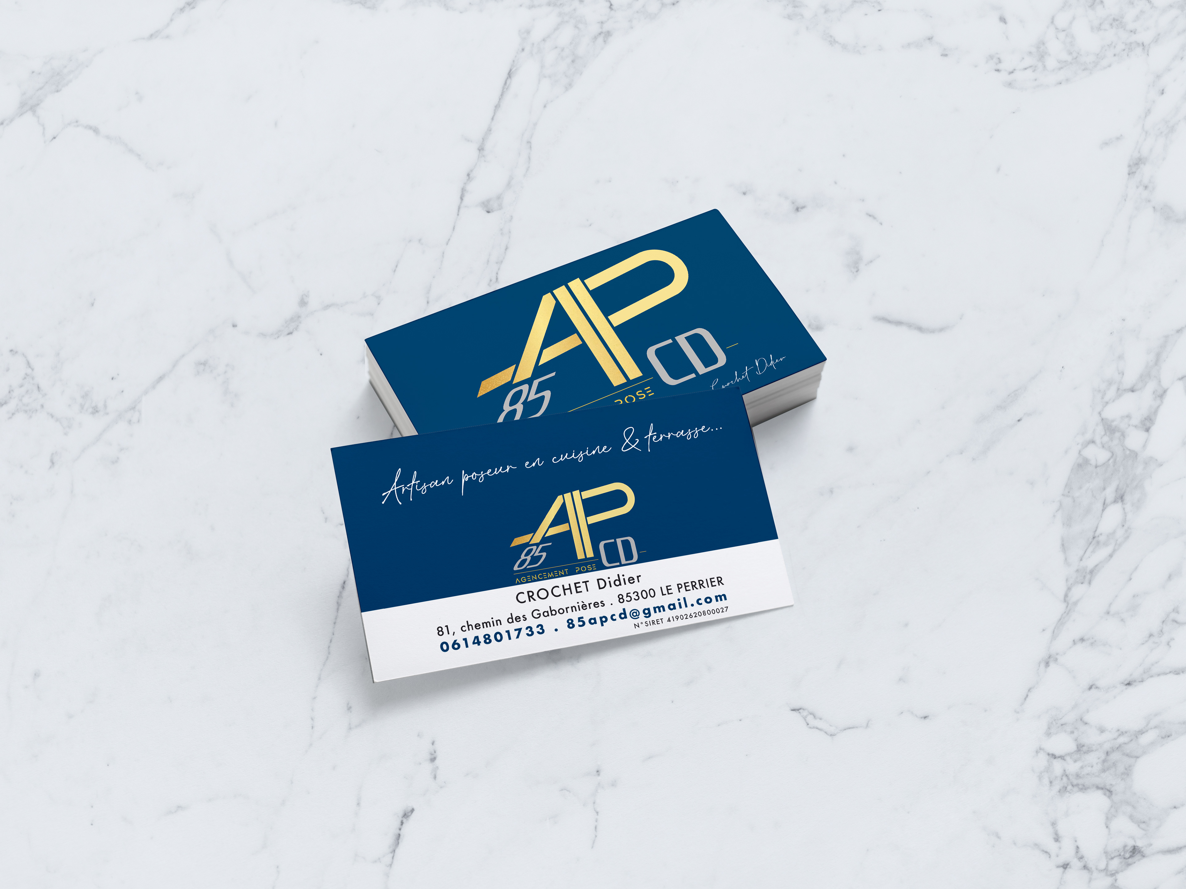 Cartes de visite AP-CD 85. Recto Verso, pelliculage Mat Soft Touch, Vernis Sélectif 3D et Dorure à Chaud.